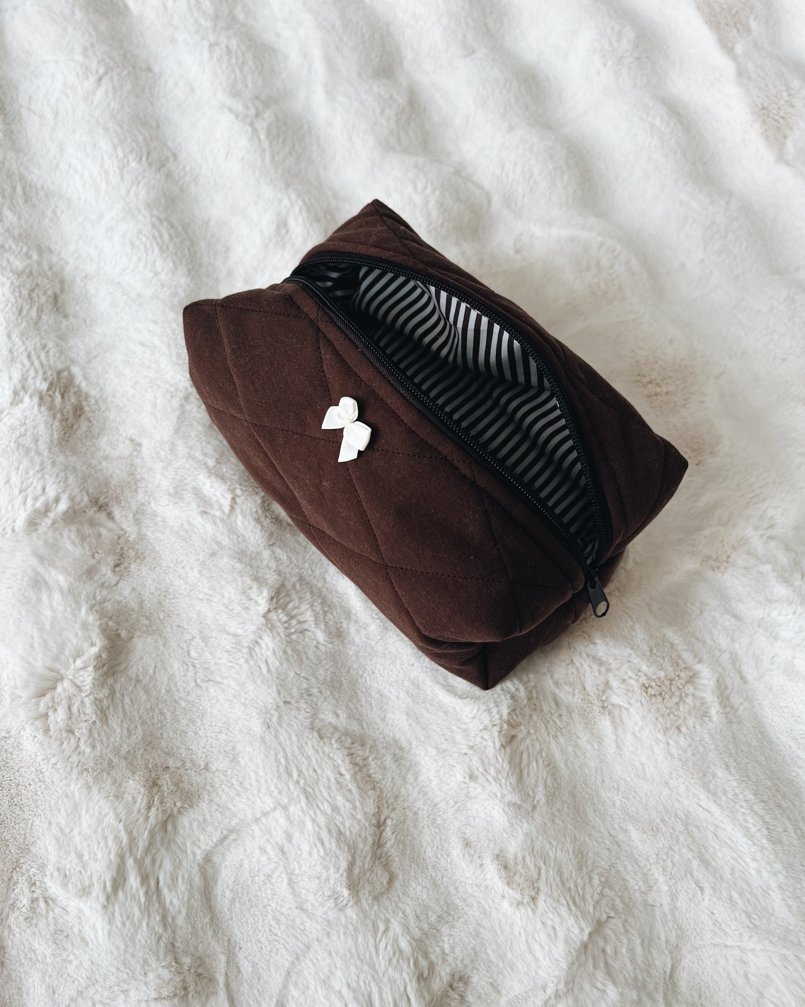 Quilted Construction: The exterior is made from a rich, deep brown fabric that is meticulously diamond-quilted, giving it a soft, substantial feel and added durability to protect the contents.